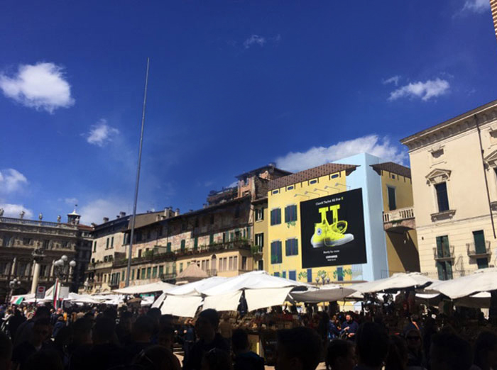 CONVERSE maxi affissione nel cuore di Verona Continua la maxi affissione nella centralissima Piazza delle Erbe a Verona, nel cuore della città. On air da metà aprile la nuova campagna di comunicazione di Converse Italia.