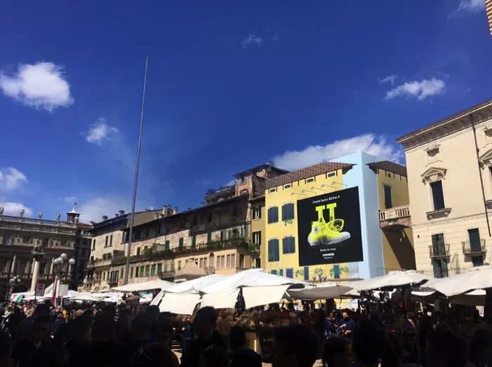 Continua la maxi affissione nella centralissima Piazza delle Erbe a Verona, nel cuore della città.