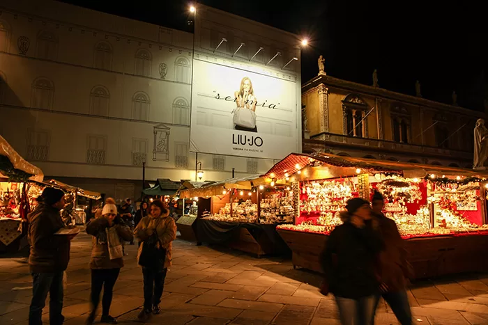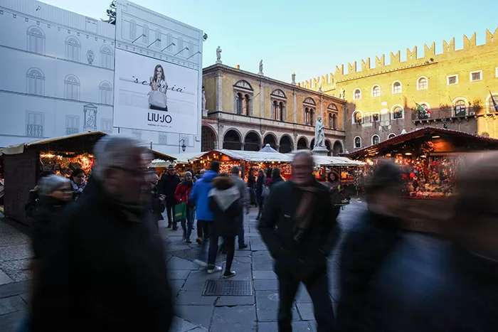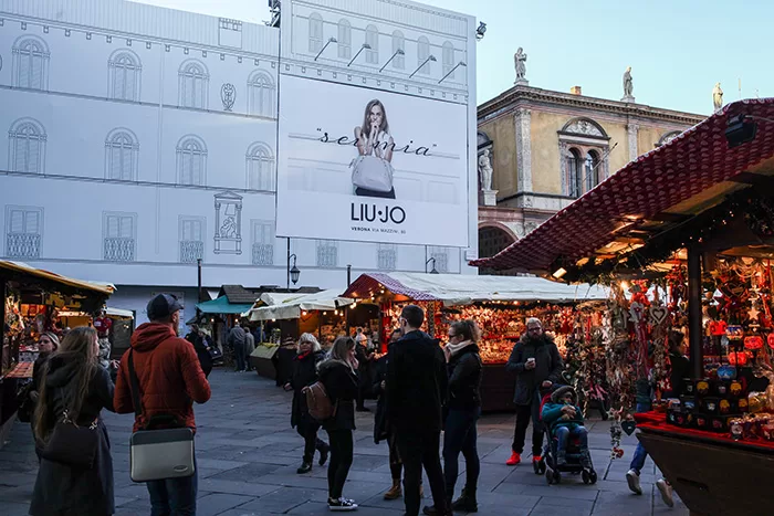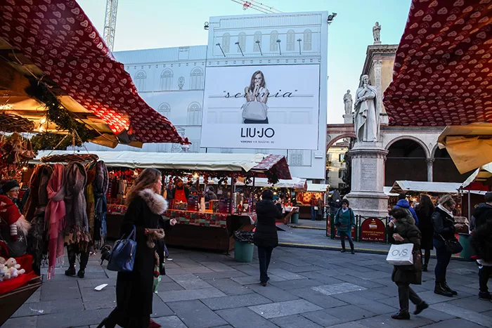 Nuova Maxi affissione nella centralissima piazza Dante nel cuore di Verona, nella splendida cornice dei mercatini di Natale, la nuova campagna pubblicitaria “LUI JO”.